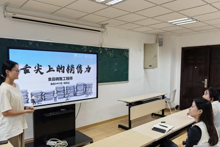 比赛中,参赛同学准备充分、表现突出。食品2401班王潇文、邓欣云分别从研发和销售方向出发,展示了清晰的职业规划与实践成果;食品2402班蒋嘉玲和轻化2302方明宇同学深入把握行业需求,结合自身优势阐述职业目标,体现出较强的专业契合度;轻化2302班朱恩通和食安2301班邓煜茹发挥稳定,思路清晰,内容紧密结合专业特色与个人特长。