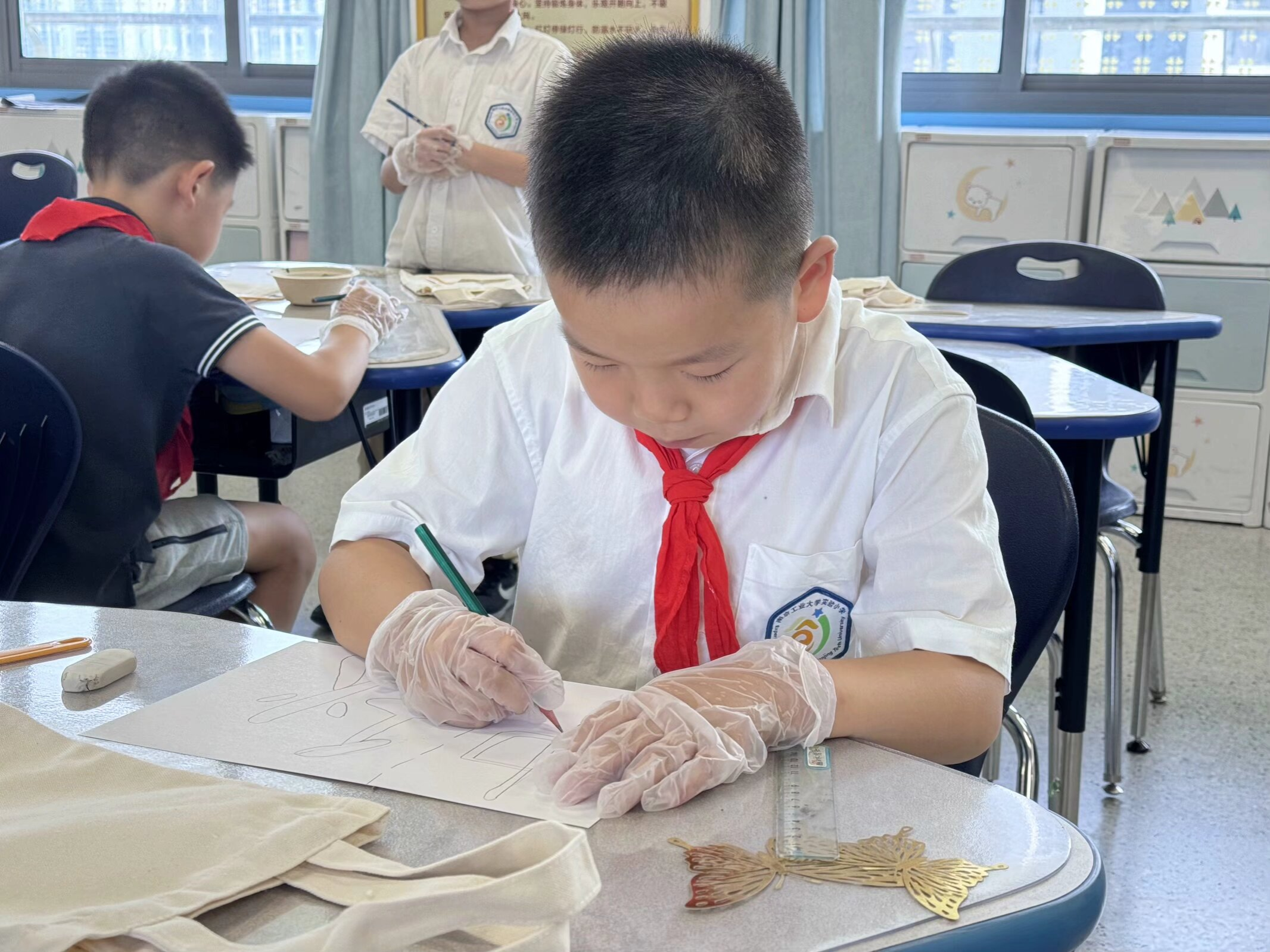活动现场,师生们首先向同学们介绍了型糊染的历史背景和基本技巧,随后引导同学们发挥想象力,设计属于自己的“中秋”主题图案。孩子们热情高涨,纷纷拿起画笔和剪刀,裁剪出“中秋”字样、月亮、桂花树、玉兔等元素,每一个图案都蕴含着孩子们对中秋节的独特理解。