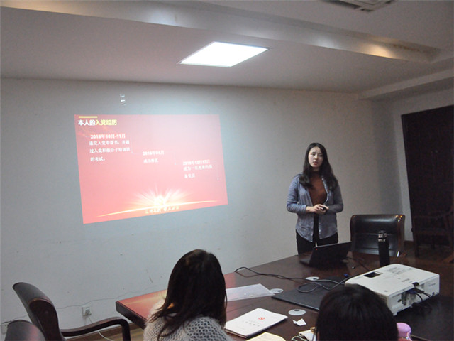 会议在庄严的气氛中进行。梁梦婷从思想、学习、工作和生活方面汇报了自己的预备期表现情况,针对宿舍较吵等问题也提出了相应的解决方法。陈静向大家讲述了自己的入党征程,并谨记群众座谈会提出的缺点,展示出在预备期内的改进情况。朱银洁在PPT上向大家展示了自己各方面的进步,也提出在政治理论方面学习的不足及改进方法。严文辉讲述了个人参加老员工社会实践、进行党课培训的心得和体会。蒲雅婕从雨花台宣誓和第一次参加党支部的各种活动引出自己在党支部的成长以及对党员的重新认识。