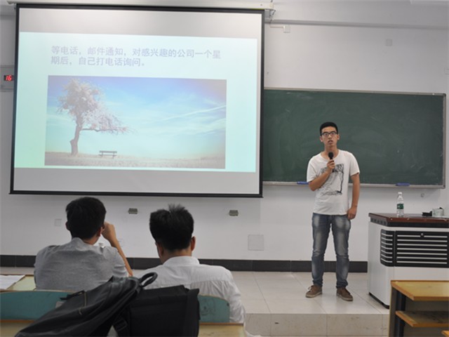 在就业分享模块中,第二党支部书记柴佳超与大家分享了有关银行应聘流程的经验。他对如何关注银行的招聘信息、怎样选取备考教材、进面后如何应对面试,做了详细的讲解。随后,由郭人森将自己3次面试经历和大家进行了分享,提出了要主动去抓住每次面试机会,牢记“先定位,再准备,不盲目”的要领。食品1301徐亮同学与大家分享了飞行员的招聘流程,提出了“身体是革命的本钱”的观点并且强调了英语学习的重要性。