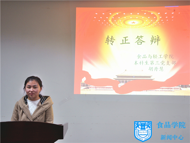 晚上6:20,会议准时开始。首先,胡丹慧同志上台进行转正PPT展示。PPT的内容大致包含了胡丹慧同志在一年预备期间对于入党之初群众向其提出的个人不足的认识和改进,以及在其思想、学习、生活、工作等方面的进步。在PPT展示的最后,胡丹慧同志向党组织表明了热切希望早日成为一名中共正式党员的决心。PPT展示后即进入答辩环节,该环节分为基础理论知识问答、简答以及时政分析三个部分。在基础理论知识问答和简答环节,胡丹慧同志会前准备充分,对评委团所提出的有关党的理论知识的问题应答如流。在时政分析问题上,胡丹慧同志结合实际和所学的理论知识,从教育、政府、人民等多方面分析,回答较为全面,使台下观众获益匪浅。