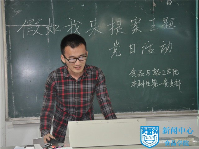 5月11日晚六点半,本科生第一党支部全体党员与积极分子早早来到厚学103教室参加党日活动的最后一个环节--议案PPT展示及现场记者提问。由各小组作为代表团进行议案PPT展示并回答由积极分子扮演的现场记者针对提案提出的问题。第一代表队代表付明教同志从2014年就业形势入手,针对老员工就业难的问题进行提案:建立老员工就业失业保障机制,消除老员工就业后顾之忧。然后,第二代表队代表王岩同志就食品安全问题进行展示。他带领大家回顾了2012年至2013年的食品安全大事件,随后与大家深入探讨如何保障食品安全,紧接着又解读了2014年全国两会中有关食品安全的要点。最后,第三代表队以教育改革为主题,从期待孩子心灵更美、体质更健康,实现起点的公平,让教育不再成为乌托邦三个方面阐述了当前社会上呈现的问题,同时也提出了教育改革的重要性与必要性。