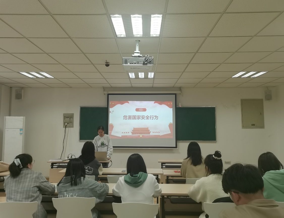 会上,徐妍、蒋云轩从国家安全教育日设立的背景、意义、《中华人民共和国国家安全法》中的国家安全的含义、危害国家安全的行为以及如何维护国家安全等方面做了介绍。