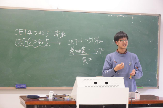 交流会期间,四位同学分别从四级考试的应试技巧、各题型的复习方法等方面,向大家分享宝贵的经验。鞠月心首先从自身学习方式出发,提倡同学们以兴趣为老师,用听音乐、看视频等方式将英语听力的学习融入到生活当中,从而减轻听力测试中的压力。戴子捷不仅向同学们简介了四级考试在大学中的影响,更概述了未来四级考试的改革方向,让同学们对于四级考试拥有了更多了解与认识。最后邵言恬和周熠阳着重介绍了翻译、作文两大题型的应试技巧,应在构思篇章结构的同时,合理使用长短句,使文章更为出彩。四位同学都重点强调了日常词汇、句式等的积累与真题的训练,“滴水穿石,非一日之功”,日复一日的努力与长久的积淀才是考试的通行证。