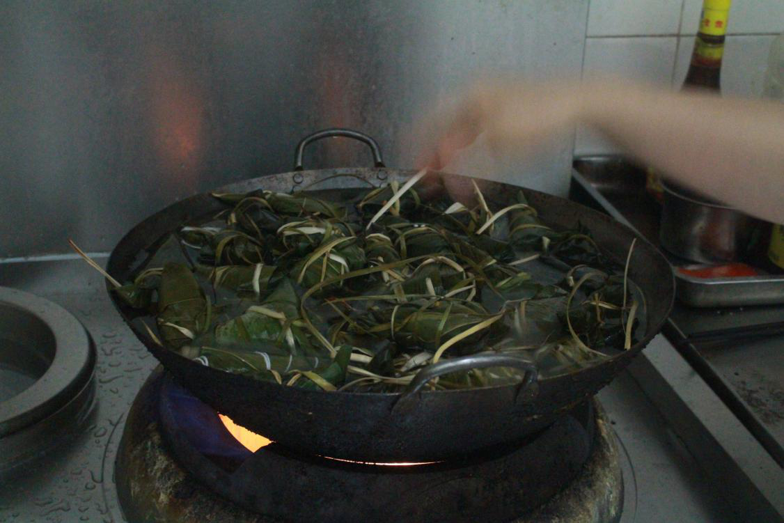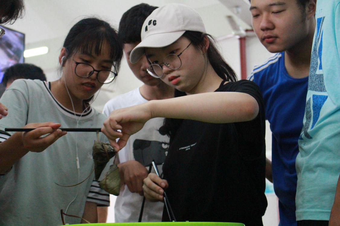 下午两点,活动正式开始。经过活动前的精心准备和视频学习,虽然同学们都是第一次动手尝试,但是开展的十分顺利。同学们热情高涨,把粽叶卷成圆锥形,将提前泡好的糯米放入三分之二,并选择喜欢的馅料放进去,然后轻轻铺上一层糯米,用粽绳捆扎起来。在基础的三角粽包法掌握后,有的同学创新了其他包法,比如四角粽、长筒粽等,遇到漏米等问题时相互配合,共同克服难题。在探讨外形创新和包扎方法改良时,同学们交流了南北方端午节文化习俗。粽子包好后,在食堂工作人员的帮助下蒸煮完成,同学们在一片粽香中享受节日美食,还给公司老师分享了他们的劳动果实。