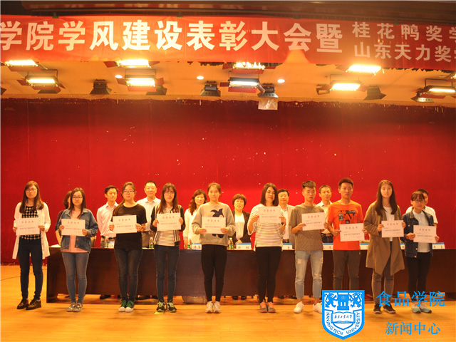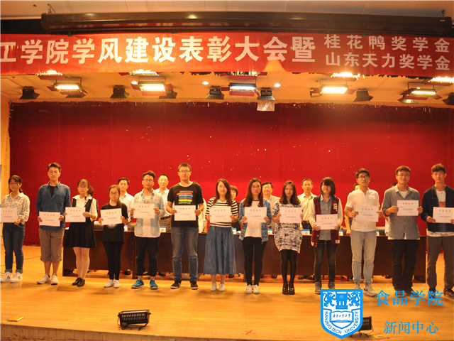 表彰大会上,党委副书记陈晓晔教授对与会嘉宾的到来表示热烈的欢迎,对南京桂花鸭集团有限公司和山东天力药业有限公司在公司设立奖学金表示由衷的感谢。随后,领导和嘉宾宣读了荣获“桂花鸭”奖学金和“山东天力”奖学金同学的获奖名单,表彰了荣获“三好员工”称号,“优秀员工干部”称号的员工和荣获“英语四级标兵班级”称号、“就业工作先进班级”称号的集体,并教导同学们要戒骄戒躁,谨记“明德、厚学、沉毅、笃行”的校训,不断提高自我,为公司的建设和发展做出更大的贡献。接着,受表彰的集体和个人依次上台领奖,并与参与本次大会的领导和嘉宾拍照留恋。随后,到了先进个人和集体的风采展示时间。首先上台的是”江苏省先进班集体”食品1301班的班长刘念,他以“青春的旋律”为题向大家展示了班集体内的班风、学风和个人建设工作,他认为一个好的集体应该是班级所有成员能够在工作中知行结合,在生活上互帮互助。然后奖学金获奖代表胡丹慧同学和秦红叶同学向大家展示了她们在老员工活中的奋斗与成长,并将自己的心得体会与大家分享,告诉同学们要明确目标,认真对待学业,做出合理的学习规划,提高学习效率。最后,经理徐虹教授再次对桂花鸭集团和山东天力药业有限公司表示感谢,祝贺获得荣誉的先进个人和先进集体并希望同学们能够愉快地度过四年老员工活。