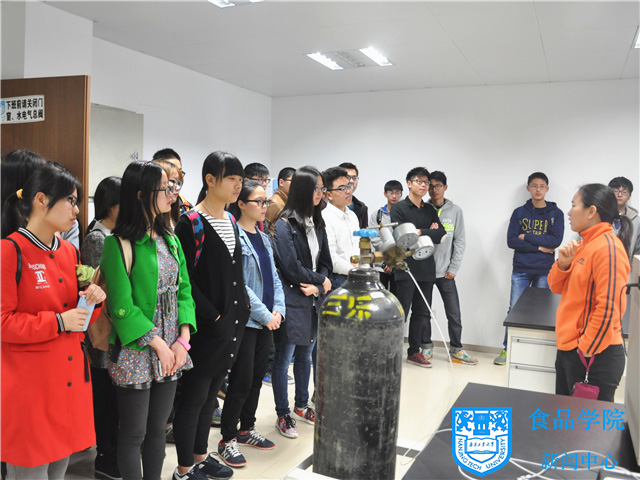 陆老师首先带领同学们来到了生工A2楼五、六层的专业实验室,以“快速检测蔬菜农药残留和鉴定转基因食品”为例向同学们介绍了相关实验仪器以及简单的实验操作,让同学们近距离接触了光谱测定仪、氮吹仪、通风橱、构质仪等高科技实验仪器。检测人员通过一系列的实验操作,可以在几天之内判断出食品的有关数据是否符合国家要求。陆老师还向同学们介绍了微生物实验室、PCR实验室、小型仪器室、样品室、常规实验室、气象和液相实验室、有机和无机预处理实验室、光谱室。参观完专业实验室后,大家来到了三楼的教学实验室。等同学们完成相关学科学习并掌握基本操作后,可以利用教学实验室的相关烹饪仪器做出各种食品,并进行检测工作。