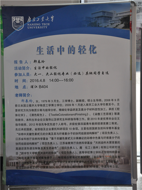 随着人们生活水平的提高和社会经济的快速发展,轻化工程所扮演的作用越来越重要,本次讲座的展开主要针对轻化专业的同学,旨在使同学们对生活中的轻化有更深的认识与了解。