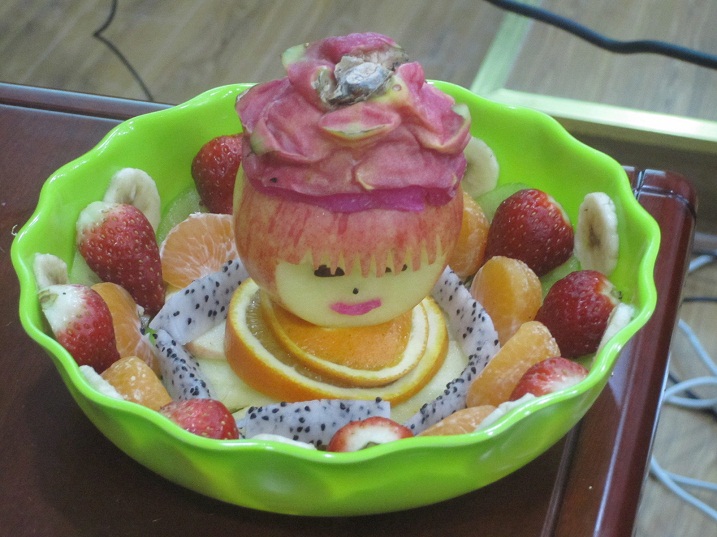 食品系系主任陆利霞教授为本次活动致开幕词。开幕式活动由多个环节组成。第一环节为“一字长蛇阵”,每组派四名选手参赛。第一个人看屏幕上的四字成语后,用肢体语言向前一名队员表现出来,依次传到最后一人,由最后一人说出成语。在这一环节中,队员们滑稽搞笑的动作惹得现场观众捧腹大笑,掌声、欢笑声经久不息。在表演成语“回眸一笑”时,一位男生把两手放在眼睛前面,眯着眼睛,不停地眨动一双眼睛,表演得有趣而生动,他的队友却给出了“眉目传情”这个答案,令所有在场观众忍俊不禁地笑起来。此环节重在考验大家的默契程度,第二环节 “知识达人”则充分考查选手们食品相关知识的掌握程度。食品安全,食品营养搭配,食品保鲜、保存等题目层出不穷。前来参赛的大多是食品专业的员工,回答起来相当得心应手,精彩的表现得到了老师们的高度赞扬。经过紧张激烈的知识问答后,充满创意的“水果秀一秀”环节,又一次将活动推向了高潮。可爱的娃娃脸、翩翩起舞的五彩蝶、娇艳的牡丹、素雅的百合、多彩的海底世界等精美的拼盘一一呈现眼前时,让人怀疑眼前所看到的是否真的是水果。同学们精彩的作品讲解更是让在场的观众豁然开朗。南京农业大学代表队所做的“时钟拼盘”指针指向八点,喻意着当代老员工要像八点的阳光那样朝气蓬勃,期待着辉煌。南京师范大学代表队的“蝶恋花”则代表着青年员工要像花朵那样充满活力、充满激情。南京林业大学作品“灿烂的笑脸”充分展现出了对多彩开心的生活的向往,生活中不缺美,因而我们要善于发现美。