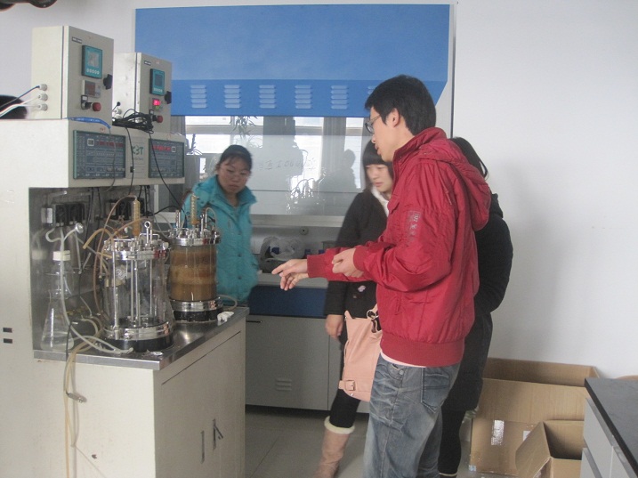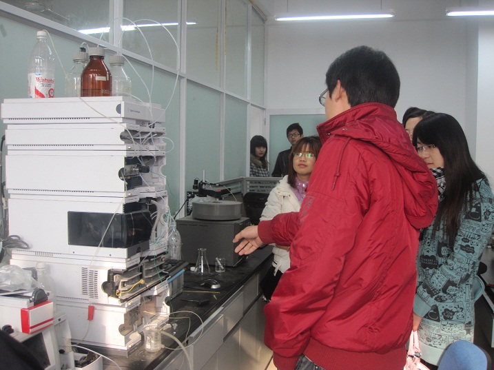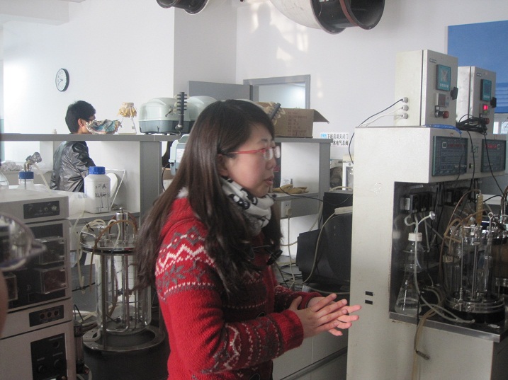 上午九点,同学们在员工会工作人员的带领下,参观了公司经理徐虹教授实验室。走进实验室,同学们看到了许多之前从未接触过的实验器材:培养细菌的摇瓶、恒温培养箱、检测物质含量的液相色谱仪、纯水仪、真空抽滤泵、灭菌锅、离心机、测糖仪等国内外先进仪器,这些让同学们大饱眼福。“咦,那是什么?”有同学指着一个大玻璃罐,好奇地问道。实验室的学姐热情地为大家作解释:“那是发酵罐,用做细菌的培养与发酵。培养的细菌可以分泌一种酶,可用于合成木糖醇等物质……”同学们听地津津有味,时而深思,时而会心一笑。听完学姐的介绍,同学们还意犹未尽,就学科发展方面许多问题向实验室博士发问,同学长学姐进行了更深入地交流,整个实验室热闹非凡。
