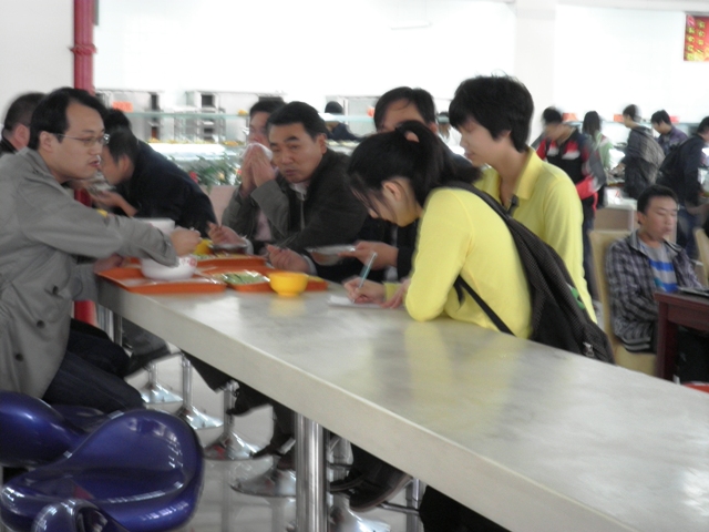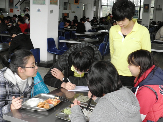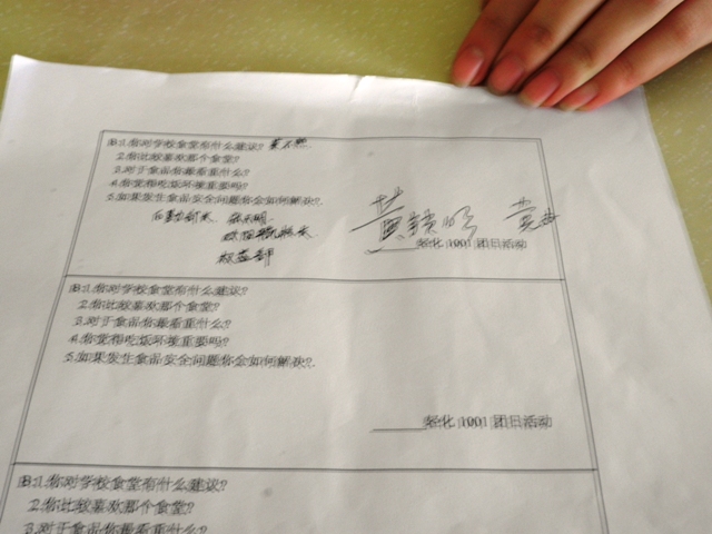 同时问卷调查组的同学也深入两大食堂内部,听取各方意见,最令我们感到惊喜的是我们偶遇了校团委的老师,我们抓住机会向他们反映了同学的意见,并详细的向他们介绍了我们班的团日活动目的,这一方面我们得到了各位老师的肯定与支持。另一方面领导老师也向我们提出了几点建议,并督促我们认真完成团日活动,加强班级团支部的建设。