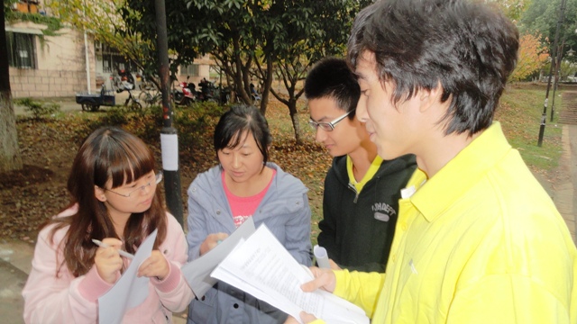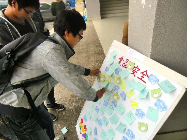 早上10点30,同学们统一身着黄色院服聚集在新南苑食堂门前,进行活动前的最后一次商讨,最终此次活动分为四组,分别在南苑和西苑同时进行宣传和调查.其中食堂门口的展板组的同学不顾严寒,深入人群中进行食品安全宣传,并让他们写下其对此次活动的看法,在路过员工中引起了极大的反响,同学名都积极留言。