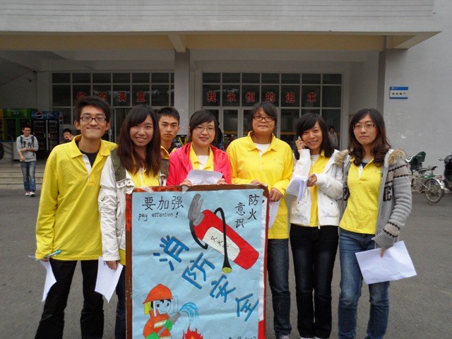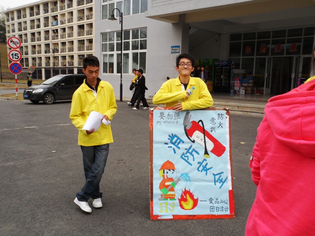 活动时间定在11月9日中午12点10分,地点为人流量较大的东苑,西苑,新南苑食堂,活动过程中我班员工发放宣传单,张贴海报。并向同学们宣传火灾预防知识,以及拉横幅提醒大家注意消防安全。中午的活动重在宣传。下午跟保卫处老师的活动重在演习。在下午3:10新南苑篮球场的空地上,班长首先强调了消防安全知识的重要性,接着,保卫处老师讲解了消防安全一些小常识以及案例。团支书在现场向观众提问消防安全知识,答对赠送小礼品。最后,保卫处老师教大家如何正确使用灭火器。在场的所以同学在老师的指导下都演习了一遍。