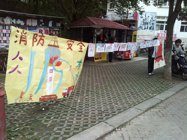 活动前期准备中,组织委员负责海报宣传这一块,宣传委员准备了100份消防安全知识的宣传单以及40张问卷题。团支书确定横幅主题并定做横幅,购买活动奖品,找保卫处老师谈消防演习的合作事宜。由于保卫处老师需要我们提供扩音器,组织委员和团支书向共青团吴杰老师暂借。