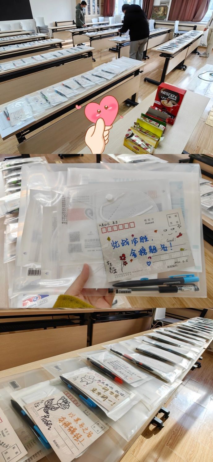N95口罩、考试套装、写满祝福的定制南工大明信片、咖啡和茶包……这份情意满满、实用又及时的“考研加油包”正承载着公司师生的殷殷期许与深切关爱,送到每一位留校考研学子的手中,陪伴他们在冲锋“研”途时笃志前行。明信片上,饱含学弟学妹们的祝福:“知道你很累也很辛苦,再坚持一下,马上就要上岸啦!”、“钻研苦读,静中生智,全力以赴,金榜题名!”、“保持好心情,吃饱穿暖,考的都会,一战成硕!”、“星光不负赶路人,你终将上岸,阳光万里!”……在字里行间和动人的小插画中给予考研学子温暖、鼓舞、振奋的精神力量。辅导员老师一边发放一边叮嘱同学们要注意防护、保重身体,以饱满的精神状态上“战场”。