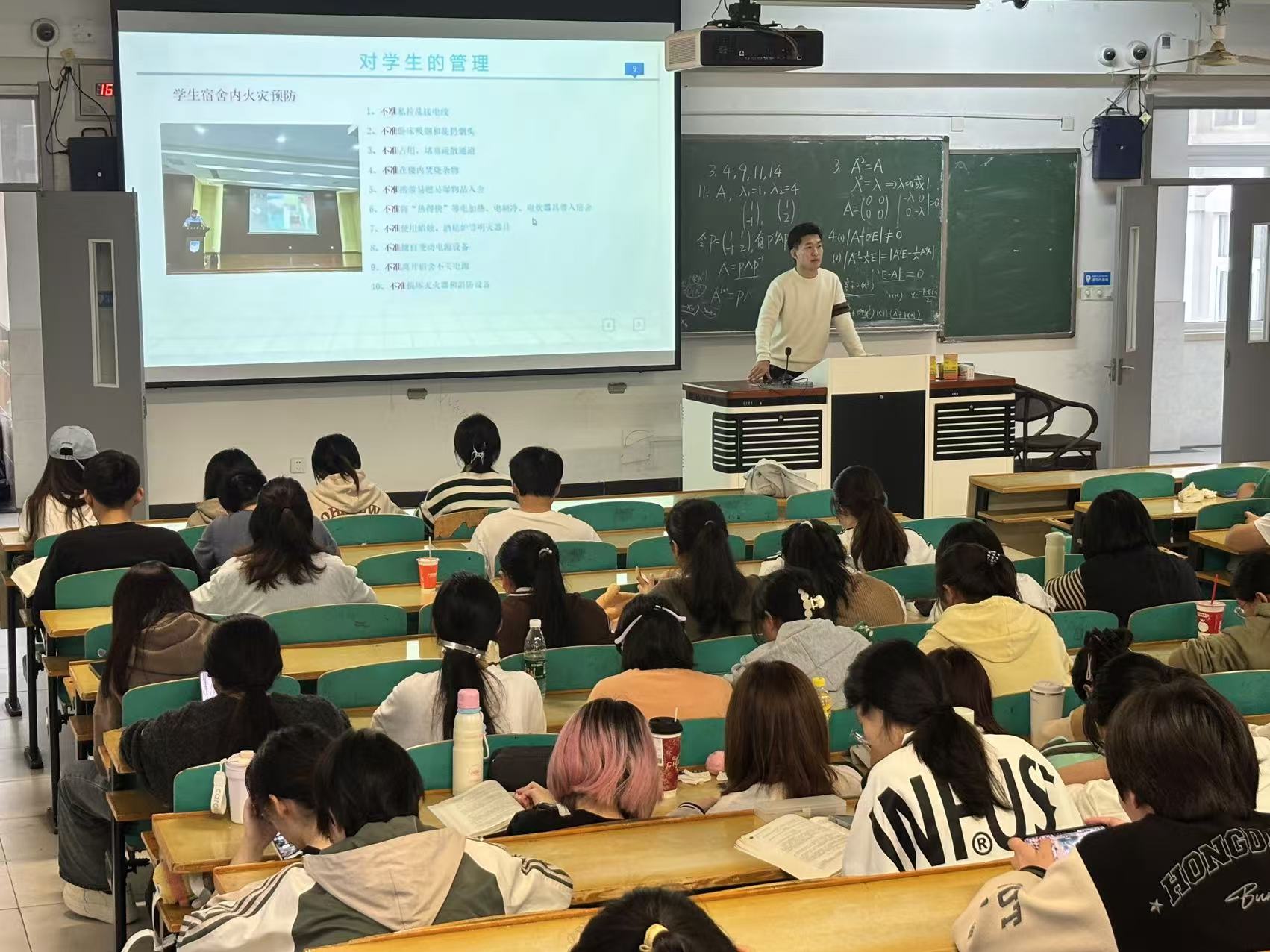 邵将老师围绕反电诈、日常管理、消防安全等方面展开讲述。他提醒所有同学做好宿舍安全检查,严禁使用违章电器,不在宿舍吸烟,切实消除各类安全隐患。针对电信防诈、安全健康等方面他做了详细的讲解。最后,他结合目前的就业形势提醒同学们做好职业规划,鼓励同学们积极参加实践活动提升自我。