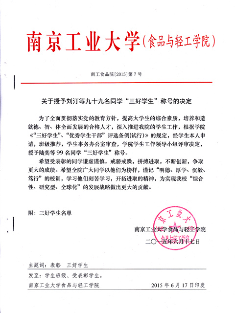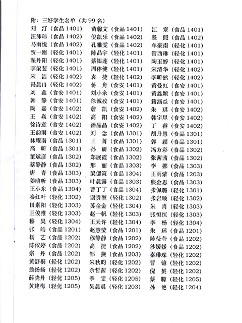 关于授予刘汀等九十九名同学“三好员工”称号的决定