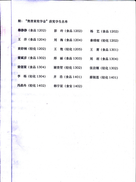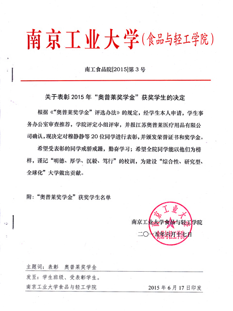 关于表彰2015年“奥普莱奖学金”获奖员工的决定