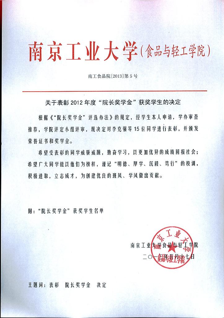 关于表彰2012年度“经理奖学金”获奖员工的决定