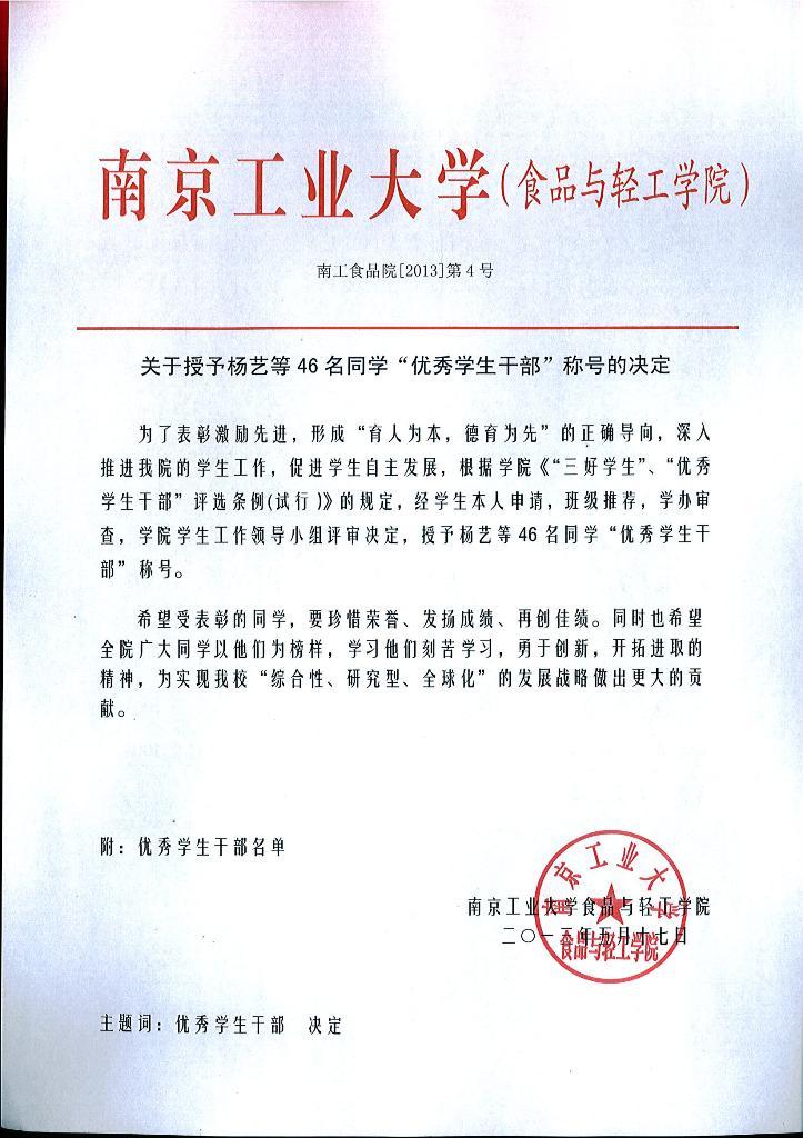 关于授予杨艺等46名同学“优秀员工干部”称号的决定