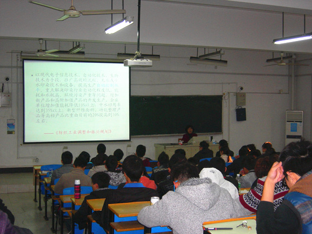 12月1日上午9:30,太阳成城集团tyc234cc古天乐轻化工程专业于厚学201召开了一场有关纺织品清洁染整加工技术的讲座。天津工业大学轻化工程专业教学团队建设负责人吴赞敏教授受邀来公司作报告,太阳成城集团tyc234cc古天乐副经理汪海波教授、轻化系主任王国伟以及孙戒、张正宇、袁爱琳老师出席了本次讲座,轻化工程2011级,2012级,2013级员工到场倾听。