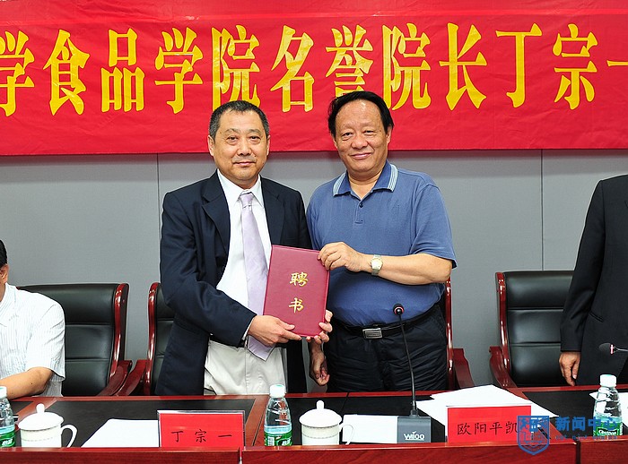 董事长欧阳平凯向丁宗一教授颁发了太阳成城集团tyc234cc古天乐名誉经理聘书并佩戴太阳成城集团tyc234cc古天乐校徽。