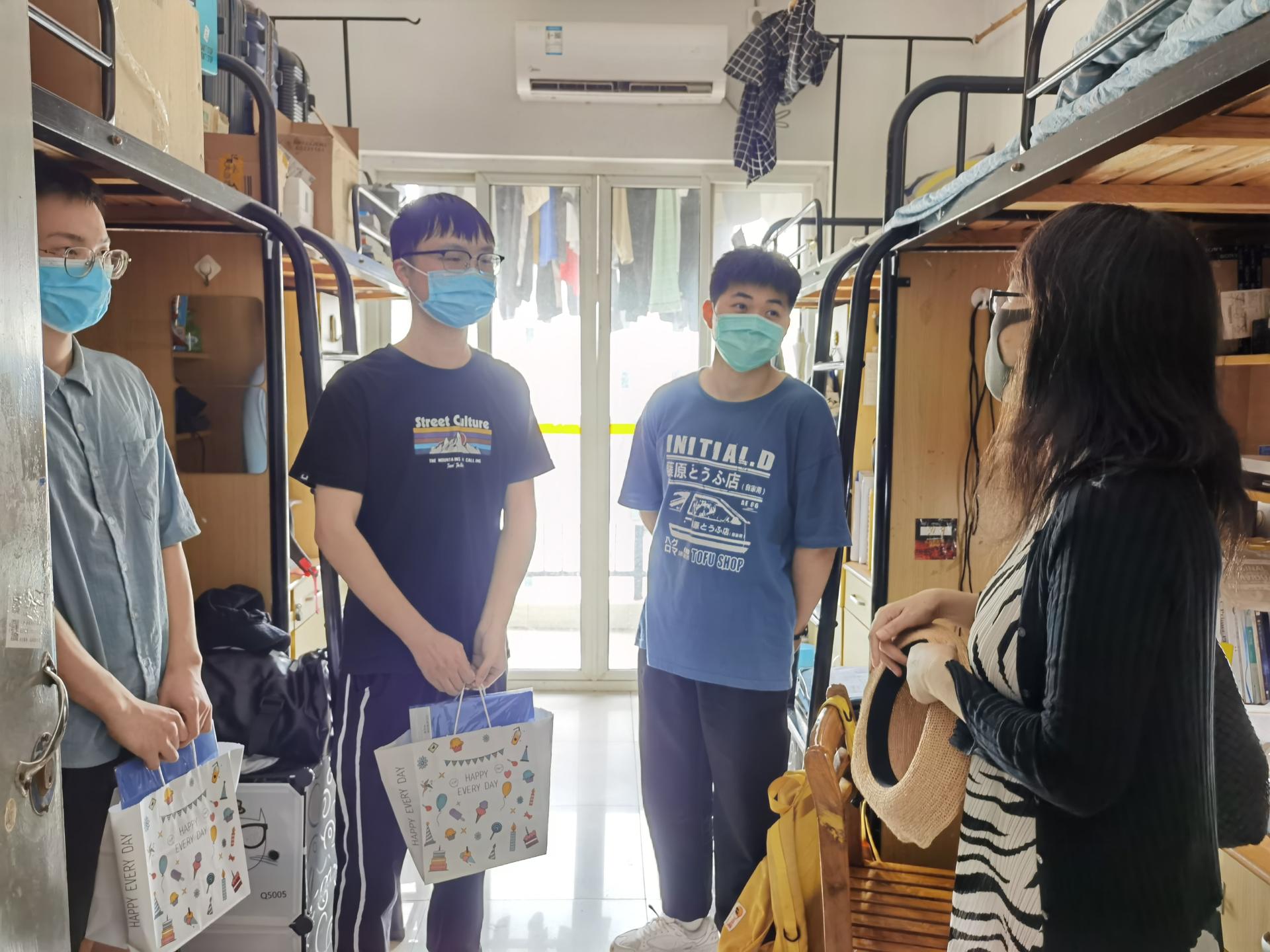 为了进一步扎实推进疫情防控工作要求,落实公司“爱与服务”工作理念,切实在关心关爱中为暑期留校员工复习备考加油鼓劲,8月18日下午,经理胡永红、太阳成城集团tyc234cc古天乐党委副书记王浩和辅导员马慧子一同前往宿舍区看望110名留校员工,并给每一位同学发放了公司精心准备的防疫消毒物品和学习用品。