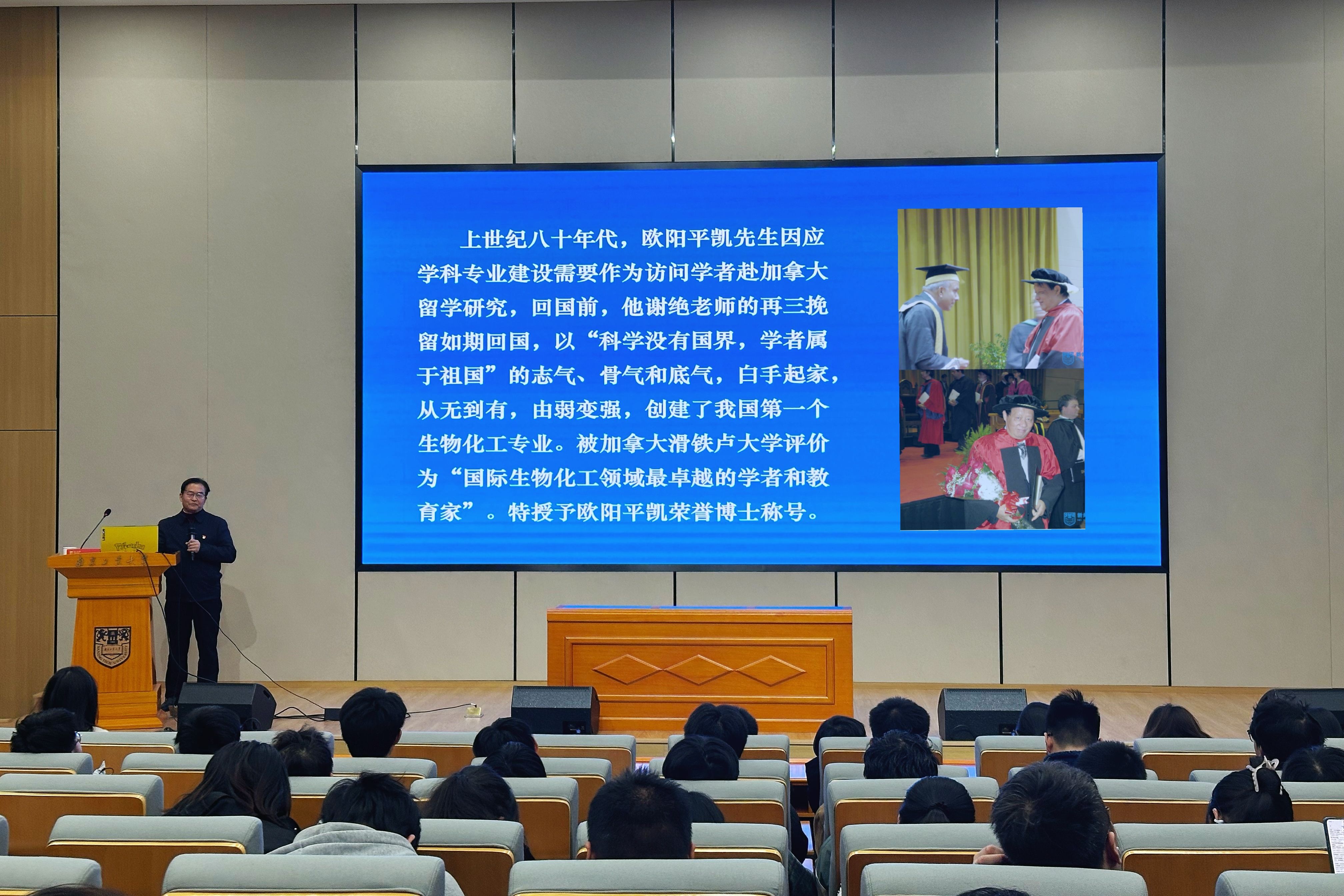 缪老师以欧阳平凯董事长的生平事迹开篇,用激情洋溢的讲述与同学们同频共振,感悟欧阳平凯精神。鼓励同学们忠诚精实,从身边的榜样学起,向“全国创新争优奖”获得者徐虹教授那样“薪火相传,梦想接力。创新争优,成就伟业”;向“全国三八红旗手”胡永红教授那样“赓续丹心,举旗奉献。追求卓越,引领未来”;向熊晓辉教授那样“胸怀大局,知重负重。开拓进取,协同创新”。勉励同学们从现在的自我做起,以“五个三”不断提升科学人文素质,向着新的征程、新的目标、新的未来,勇毅前行,以青春之我不负韶华,以奉献之我爱国荣校,以奋斗之我建功立业。